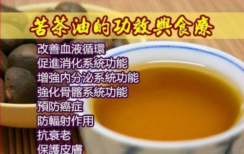 时常腰酸背痛者,可以苦茶油炒姜片食用,据说有舒筋活血的效果。糖尿病宿疾或是时常脚步抽筋:可以用苦茶油煮热,加入红叶菜与猪肝切片,加一点盐炒熟之后食用。