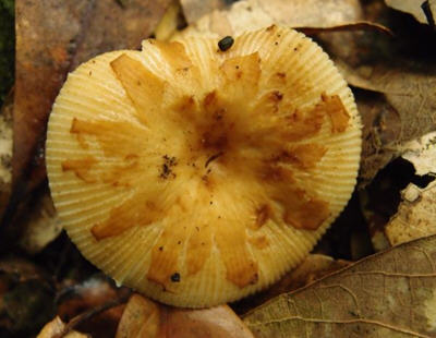 子实体中等大,极像臭黄菇,具腥臭气味及辣味。菌盖直径3~9.5cm,扁半球形,平展后中部稍下凹,污黄至褐黄色,粘,边缘表皮常龟裂并有小疣组成的民享粗条棱似鱼鳃。菌肉污白色。菌褶污白色至淡黄褐色,直生至稍延生,褶缘色深且粗糙,等长或不等长。菌柄长8~10cm,粗0.6~1.5cm,圆柱形,具褐黑色小腺点,有时细长且基部渐细,污黄色,内部松软至中空,质脆。孢子印白色。孢子淡黄,具明显刺棱。