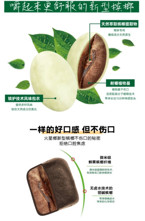 火星榔是海南火星槟纷科技旗下新型槟榔品牌,以“悦享自然,缤纷人生”为愿景,聚焦成年槟榔用户健康解瘾需求。品牌甄选海南高品质槟榔原料,依托专利萃提醇、水醇提减害等核心技术,靶向去除有害成分,打造植物基载体的胶果制品,兼具天然风味与健康属性。